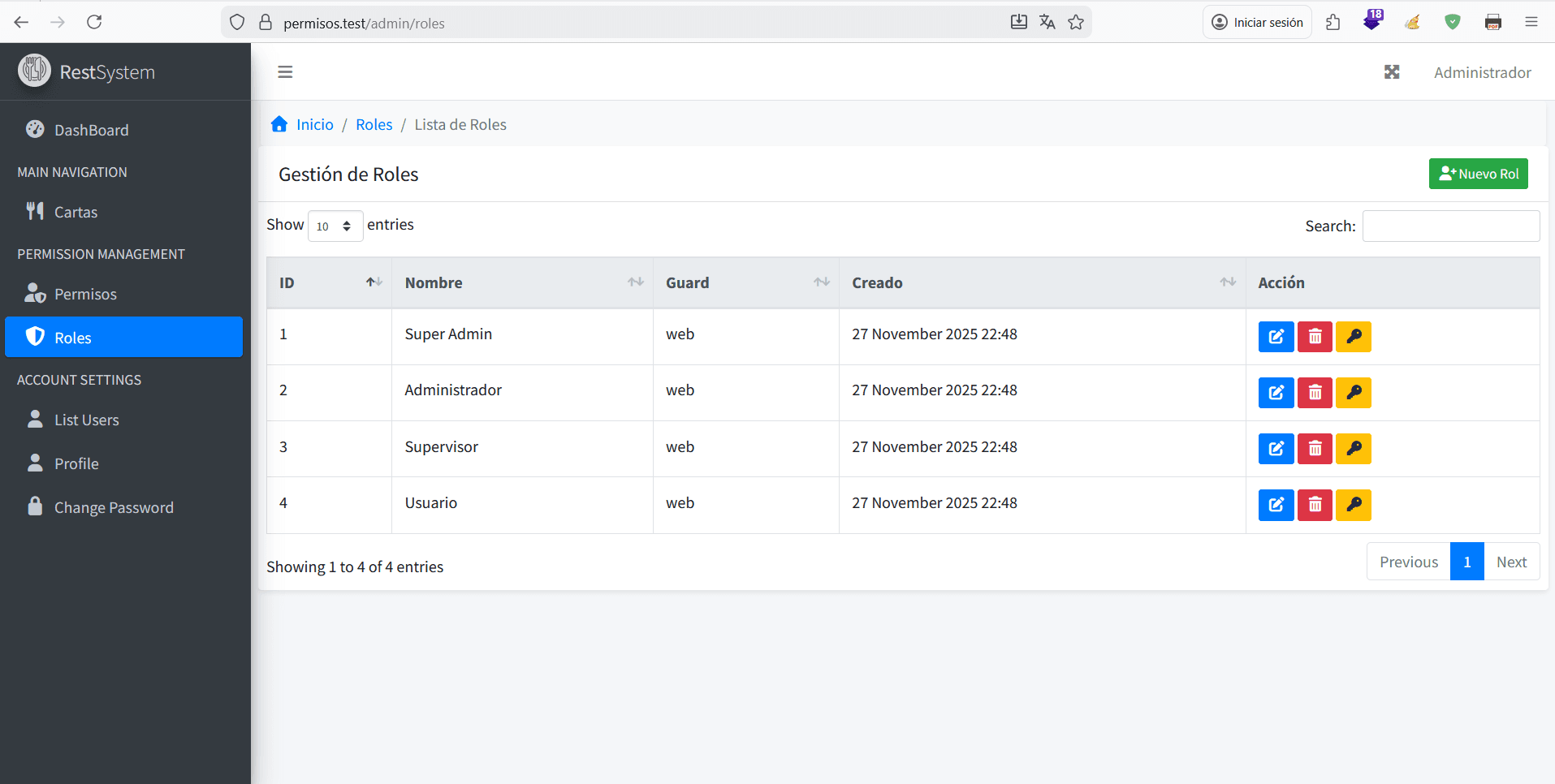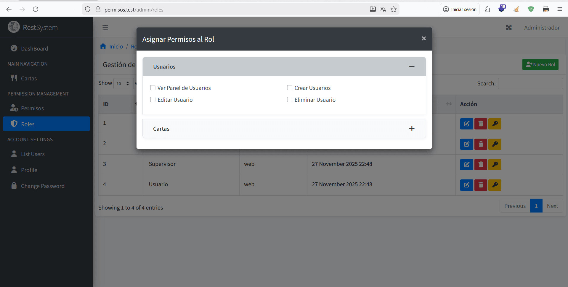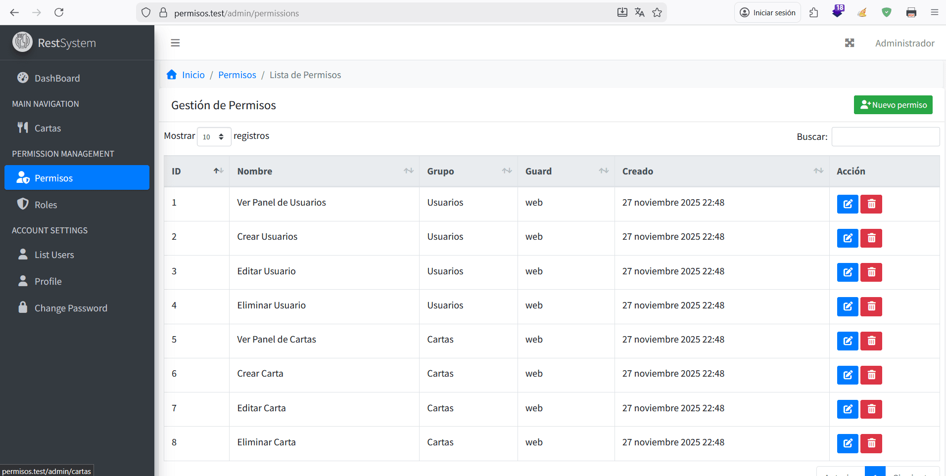 Controla quién puede acceder, editar, eliminar o visualizar cada módulo del sistema.