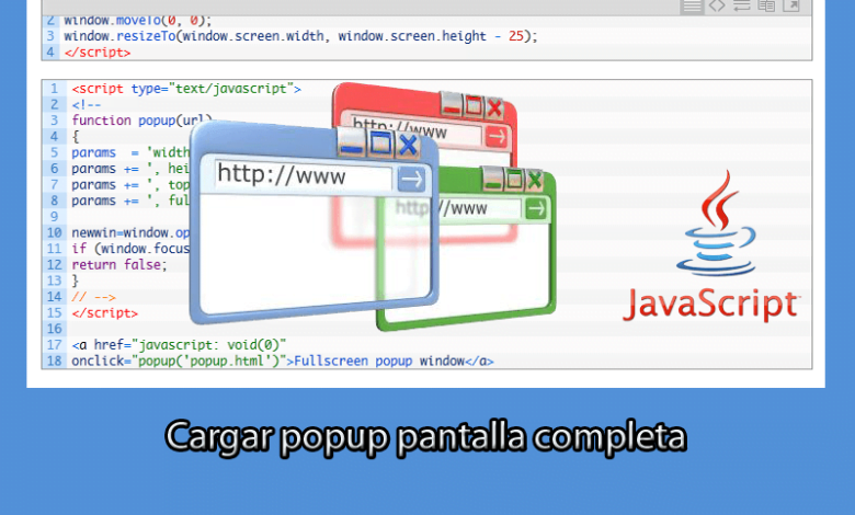Cargar popup pantalla completa: Full screm. Una variación popular sobre el tema de las ventanas emergentes se abre una ventana en modo de pantalla completa . Pantalla completa significa que la ventana es el tamaño completo de la pantalla y ofrece la mayor área de visualización de la página como sea posible . MSIE y Netscape toman diferentes parámetros para…